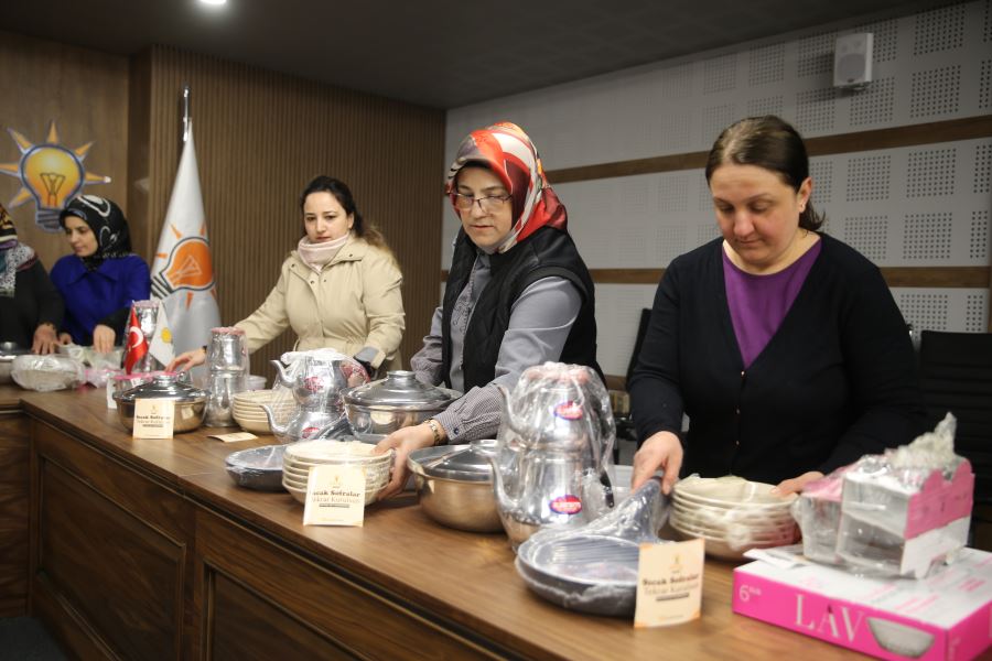AK Parti Mardin İl Başkanlığında kadınlar, tencere, tava, çaydanlık, tabak, kase, bardak, çatal, kaşık, saklama kabı, ekmek bıçağı ve sofra bezinin yer aldığı 110 seti afet bölgelerine gönderilmek üzere hazır hale getirdi.